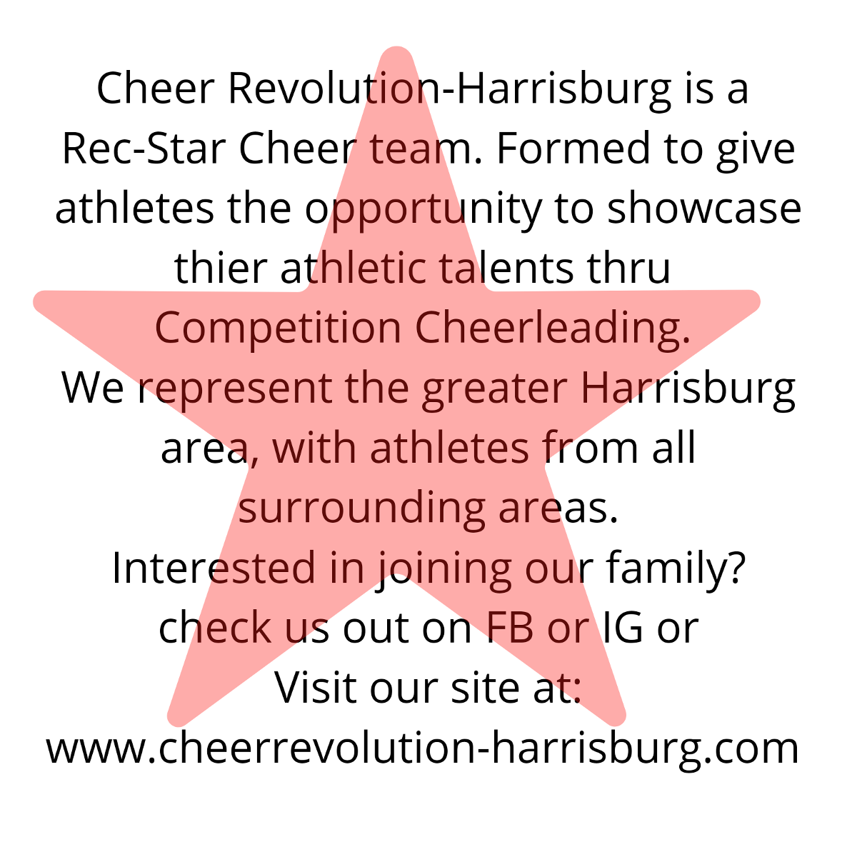 Cheer Revolution is a Performance Rec Cheer Team established in 2017. Our goal is to make competitive cheer available to athletes who may not get an oppurtunity to experience this amazing sport otherwise.